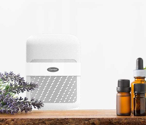 Čistička vzduchu Carrier Novel Air má speciální nádoby a houbičky pro umístění éterických olejů, které během provozu difundují do prostoru.