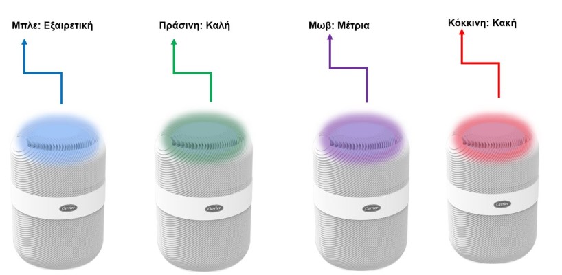 Zařízení rozpoznává kvalitu vzduchu a jeho světelný indikátor mění barvu v závislosti na úrovni čistoty vzduchu: vynikající (modrá), dobrá (zelená), střední (fialová), špatná (červená)